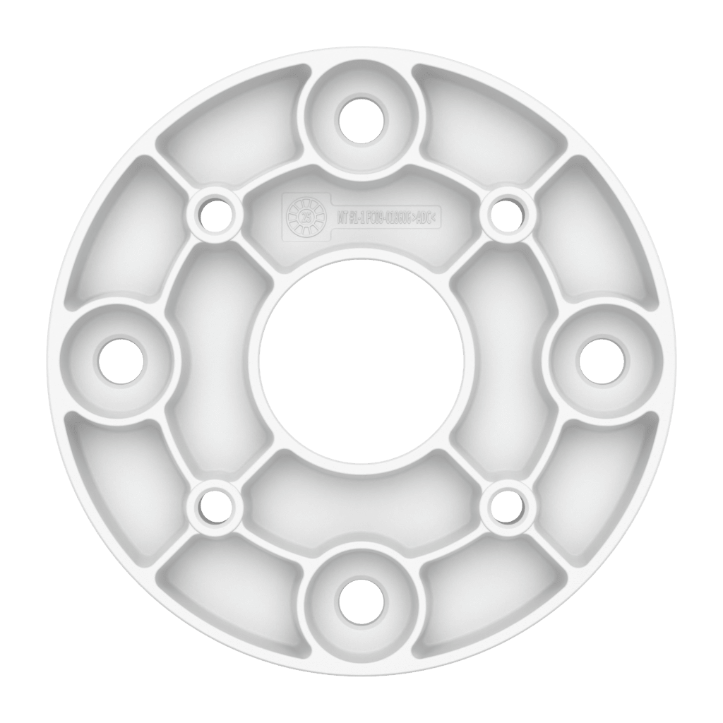El SBP-004PBW es un convertidor de montaje especializado diseñado para adaptar dispositivos con un patrón de orificios PCD de 4" (101.6 mm) a estructuras de montaje con orificios PCD de 4.75" (120.65 mm). Este componente mecánico de alta precisión está fabricado en aluminio robusto, garantizando integridad estructural en instalaciones de cámaras PTZ rugerizadas. Su diseño circular facilita una transición segura y alineada entre la base de la cámara y el soporte de pared o techo. Es una solución crítica para ingenieros de sistemas que requieren compatibilidad mecánica exacta en entornos de videovigilancia profesional.